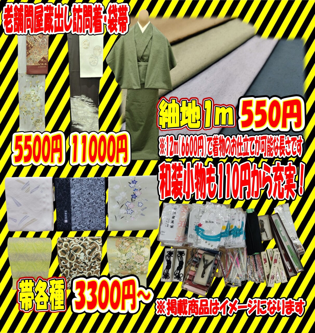 紬着尺・小紋着尺・袋帯・名古屋帯などが数千円台から入荷致します。